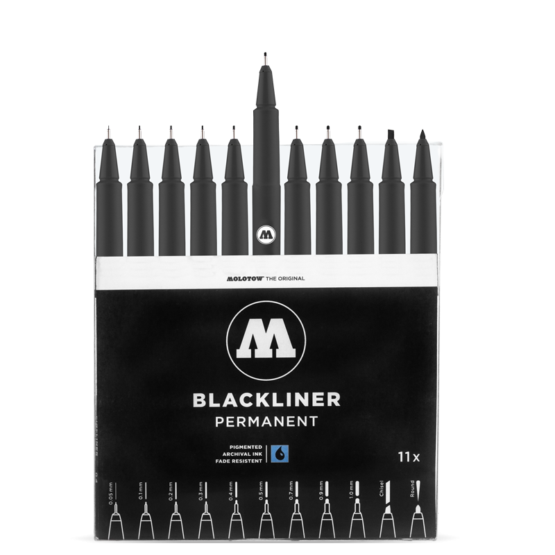 Виготовлений у Німеччині набір Molotow Blackliner Complete Set 11шт ідеально підходить для створення контурів, технічних малюнків, скетчів та детальних ілюстрацій, де необхідна максимальна точність та контроль над лінією. Це професійний інструмент, який задовольнить найвибагливіші вимоги до якості та довговічності.